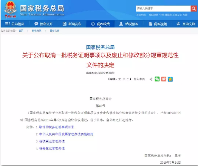 2019年7月31日,《國家稅務(wù)總局關(guān)于公布取消一批稅務(wù)證明事項(xiàng)以及廢止和修改部分規(guī)章規(guī)范性文件的決定》(國家稅務(wù)總局令第48號(hào))發(fā)布,取消了發(fā)票丟失登報(bào)作廢聲明。